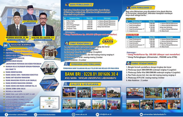 Bersama ini kami umumkan kepada adik-adik para alumni SMA,SMK, dan MA, dan Bapak/Ibu, bahwa Kampus Universitas Labuhanbatu telah membuka Penerimaan Mahasiswa Baru (PMB) Tahun Akademik 2026/2027, Untuk informasi pendaftaran dapat menghubungi langsung contac person panitia yang ada dalam player dan brosur.